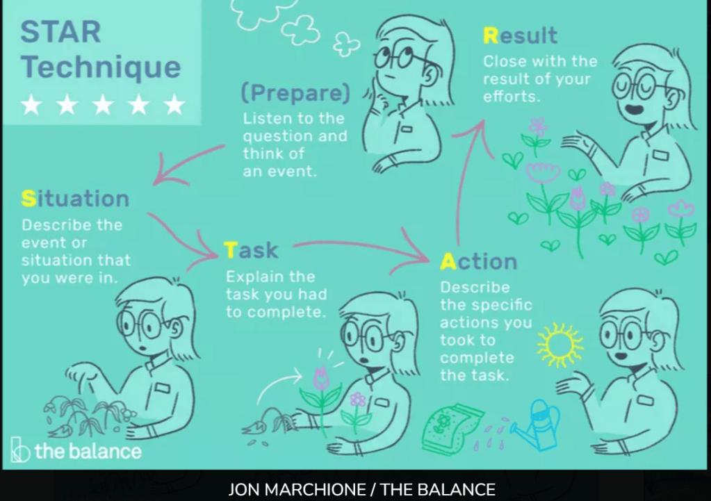 Great! You can come up with some stories about yourself and your work, now, how do we translate that to a successful interview style? This is where we bring in the STAR method.